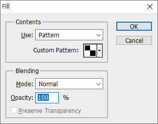 포토샵 메뉴의 에디트 -> 필(채우기)을 선택해 아까 지정했던 체크무늬 패턴을 선택해 줍니다.