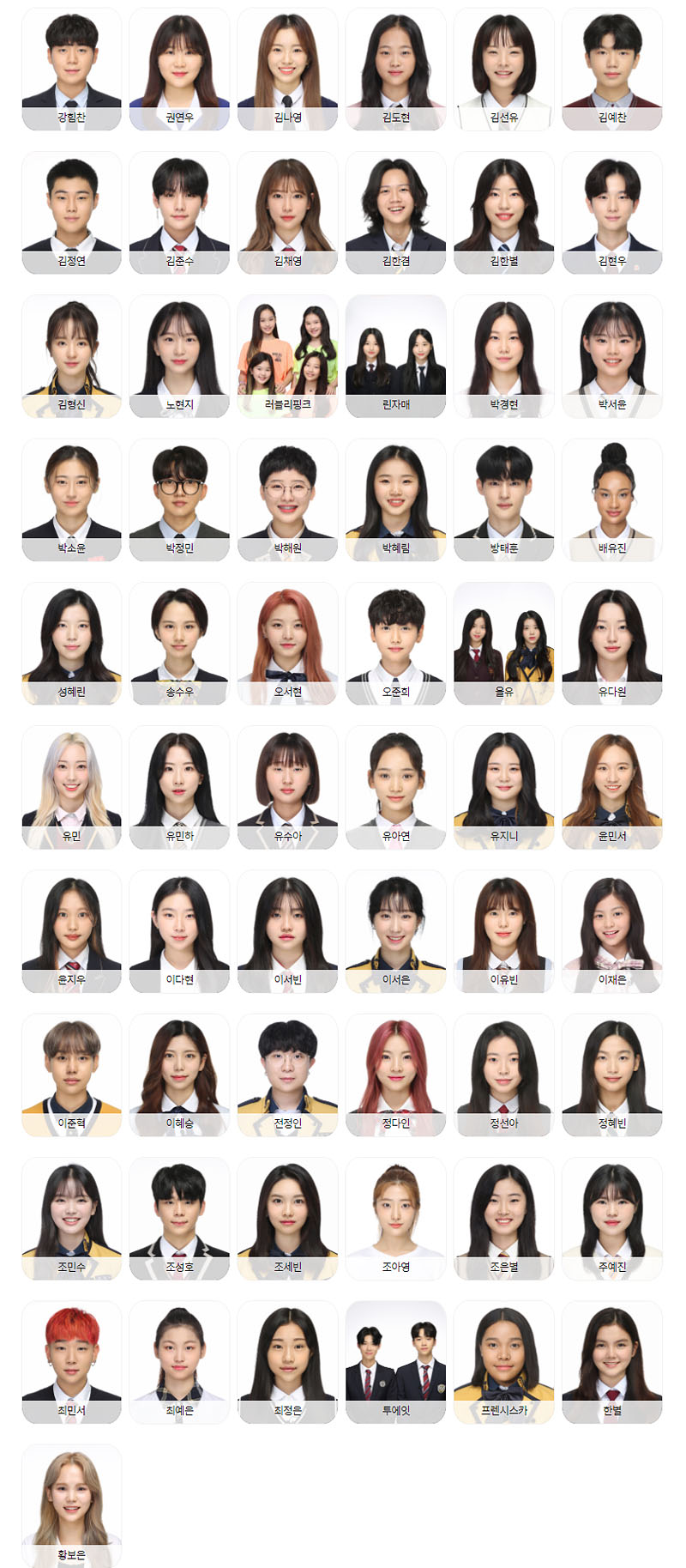 강힘찬, 권연우, 김나영, 김도현, 김선유, 김예찬, 김정연, 김준수, 김채영, 김한겸, 김한별, 김현우, 김형신, 노현지, 러블리핑크(정시우, 강민주, 정민선, 방민정), 린자매(이애린, 이채린), 박경현, 박서윤, 박소윤, 박정민, 박해원, 박혜림, 방태훈, 배유진, 성혜린, 송수우, 오서현, 오준희, 올유(남유주, 강다민), 유다원, 유민, 유민하, 유수아, 유아연, 유지니, 윤민서, 윤지우, 이다현, 이서빈, 이서은, 이유빈, 이재은, 이준혁, 이혜승, 전정인, 정다인, 정선아, 정혜빈, 조민수, 조성호, 조세빈, 조아영, 조은별, 주예진, 최민서, 최예은, 최정은, 투에잇(로빈, 이한준), 프렌시스카, 한별, 황보은